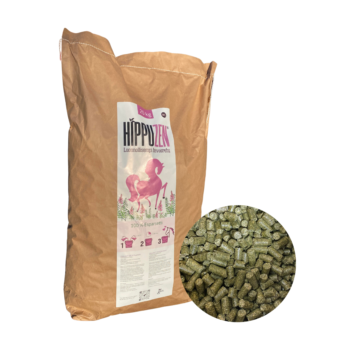 Hippuzen Esparsetti (eng. Sainfoin, lat. Onobrychis viciifolia) on erinomainen valinta hevosesi ruokavalion täydentämiseen. Se on valmistettu korkealaatuisesta esparsetista, joka tunnetaan ravinteikkaana ja herkullisena rehukasvina.